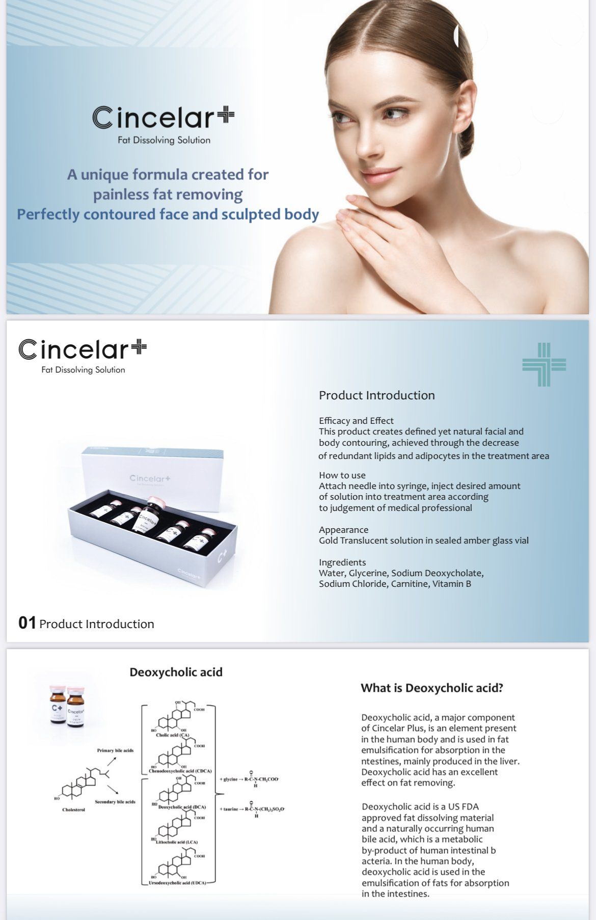 Cincelar Plus is a fat removing solution that is based on Deoxycholic acid, which is applied to selective sites.